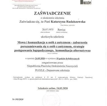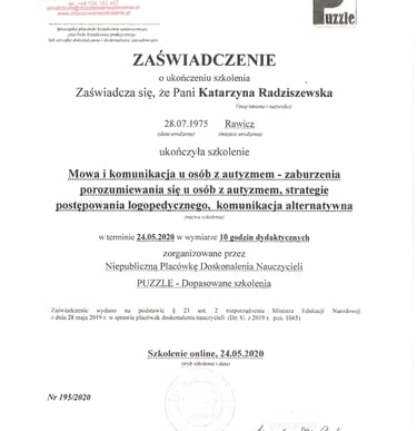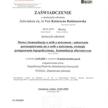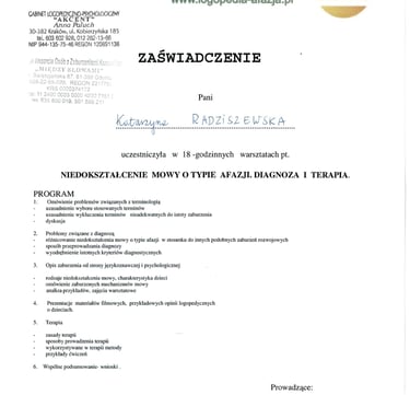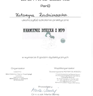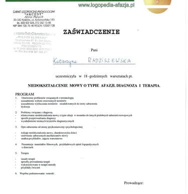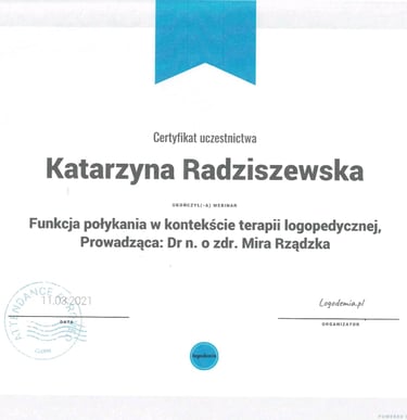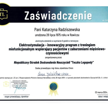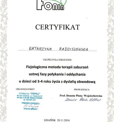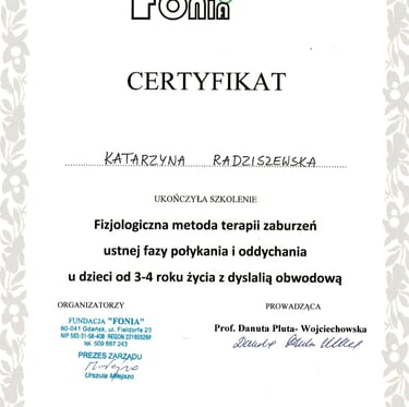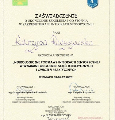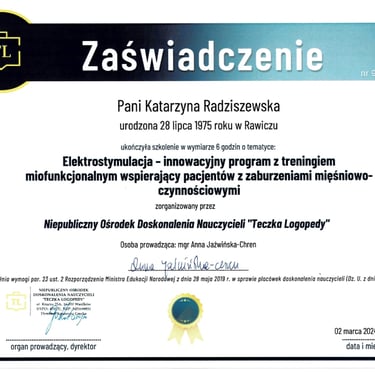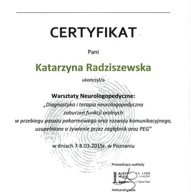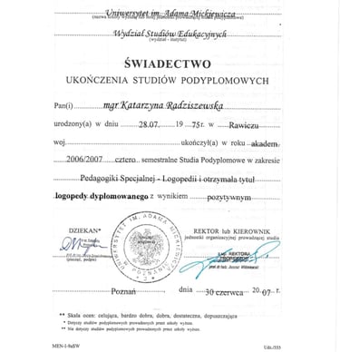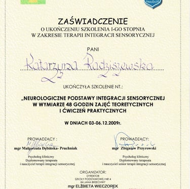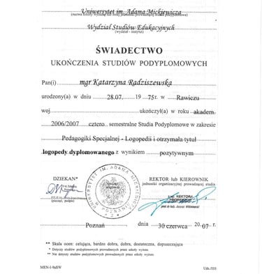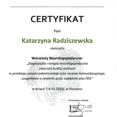 Jestem neurologopedą z wieloletnim doświadczeniem w pracy zarówno z dziećmi, jak i dorosłymi. Ukończyłam studia na Uniwersytecie im. A. Mickiewicza w Poznaniu oraz na Uniwersytecie Gdańskim. Jestem także specjalistą terapii ręki oraz certyfikowanym terapeutą integracji sensorycznej. Wiedzę zdobytą na niezliczonej ilości szkoleń i warsztatów łączę z długoletnią praktyką. Moimi podopiecznymi są często osoby z problemami neurologicznymi - wynika to zarówno z ukończonych przeze mnie studiów, jak i osobistych doświadczeń. Współpracuję z lekarzami ortodontami, dzięki czemu moja terapia ma wymiar bardziej kompleksowy i holistyczny.
